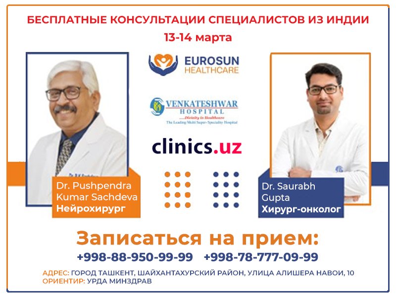 Бесплатная консультация нейрохирурга и хирург-онколога из Индии в клинике Eurosun 13-14 марта в Ташкенте