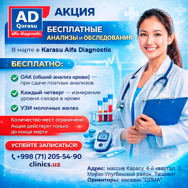 АКЦИЯ В Karasu Alfa Diagnostic БЕСПЛАТНЫЕ АНАЛИЗЫ И ОБСЛЕДОВАНИЯ В МАРТЕ