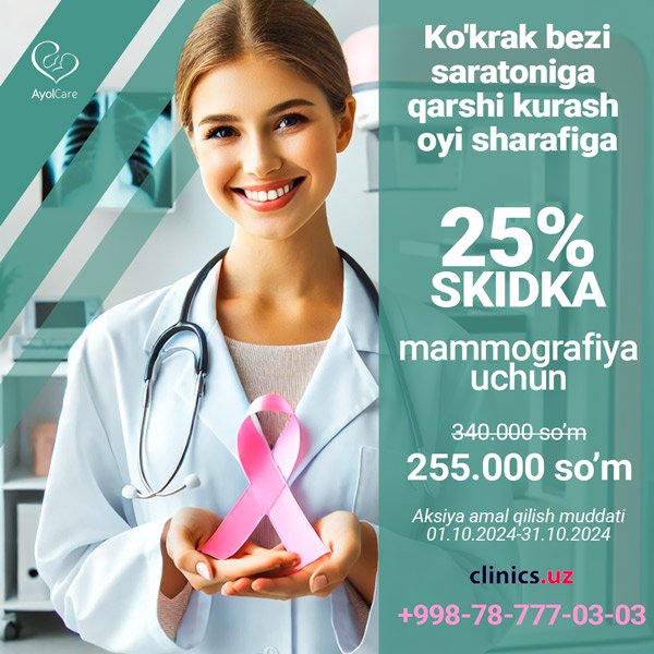 Ko'krak saratoniga qarshi kurash oyi munosabati bilan Ayol Care shifoxonasi mammografiyaga - 25% chegirmani e'lon qiladi!