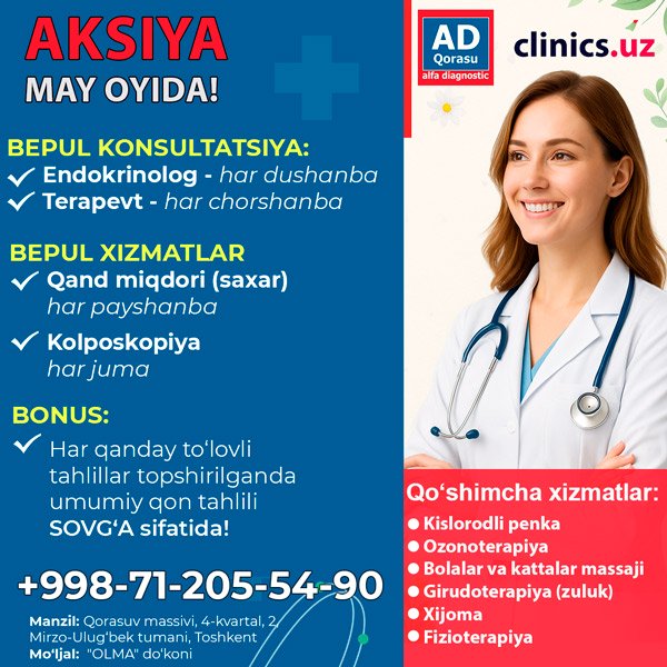 AKSIYA MAY OYIDA — HAR HAFTA BEPUL XIZMATLAR QORASU ALFA DIAGNOSTIC KLINIKASIDA!
