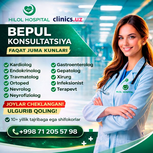 BEPUL KONSULTATSIYA malakali shifokorlardan — har juma kuni Hilol Hospital klinikasida!